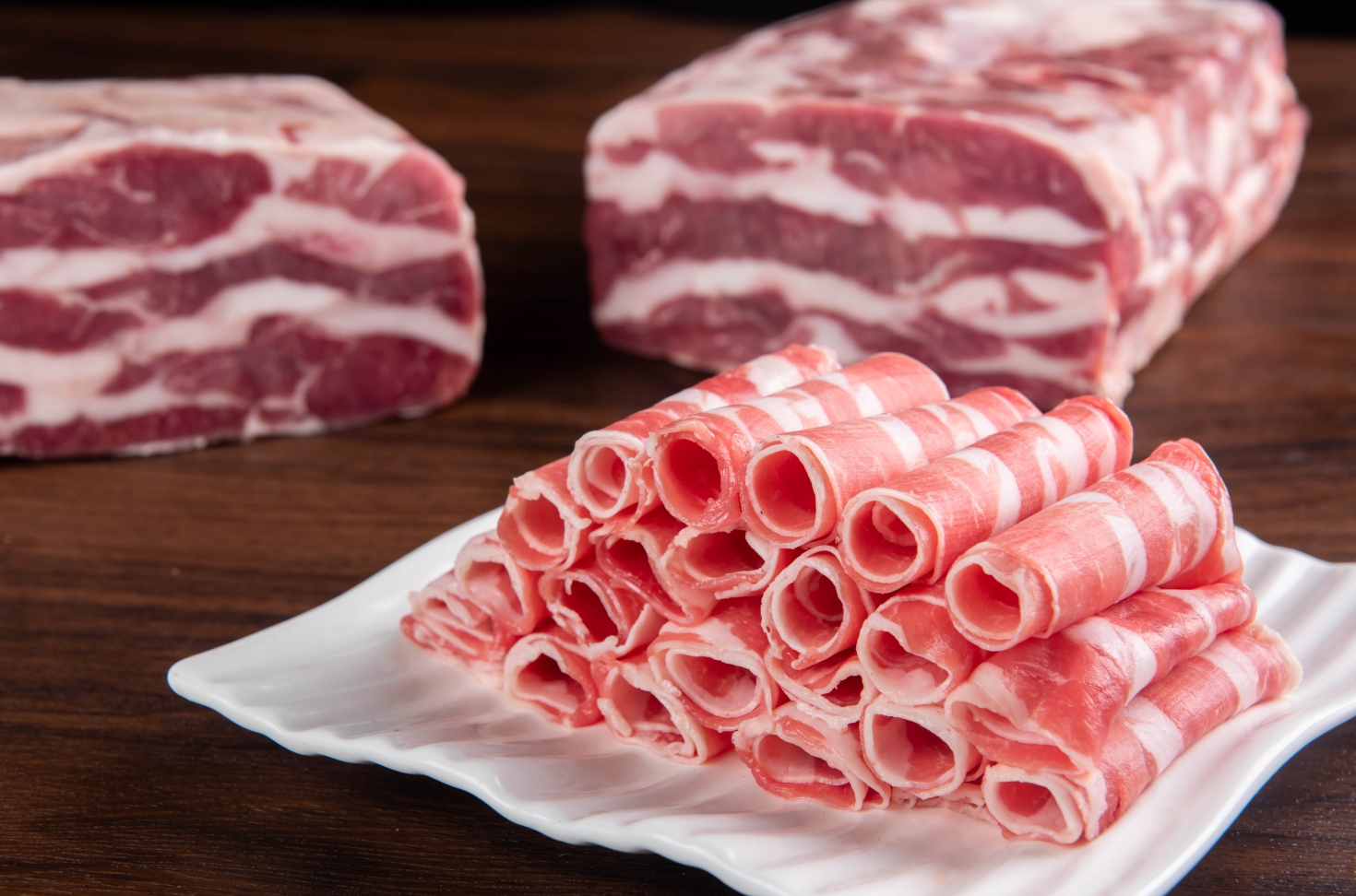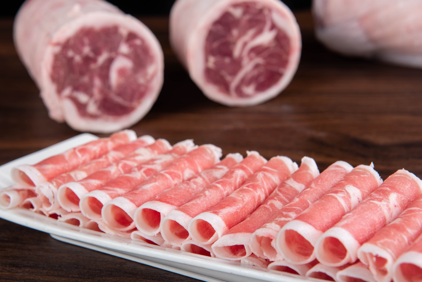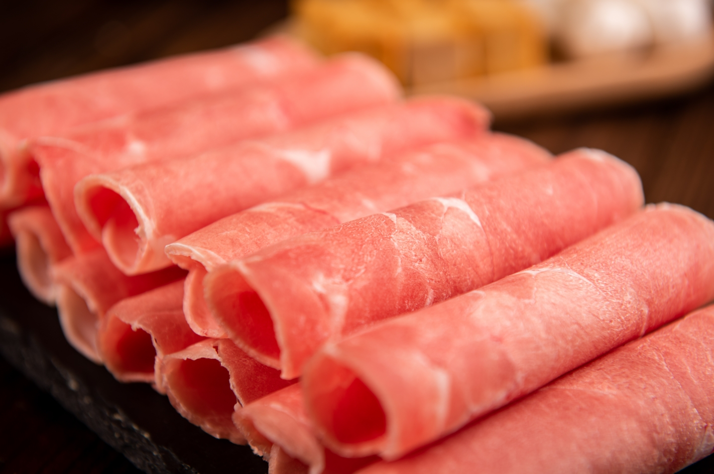 精选优质背肉,肥瘦比例恰到好处,肉质细腻柔软,每一片都薄厚均匀,在锅里一涮,立马变色卷曲。