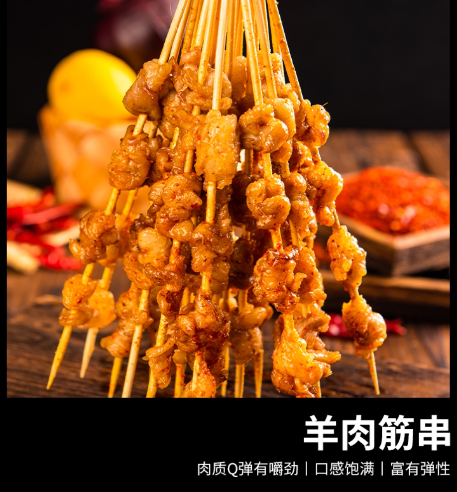 喜欢有嚼劲口感的千万别错过羊肉筋串!精选羔羊身上的优质肉筋,处理得干净又卫生。烤好的羊肉筋串,外表裹着一层油亮的酱汁,看起来就让人食欲大增。