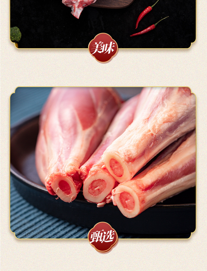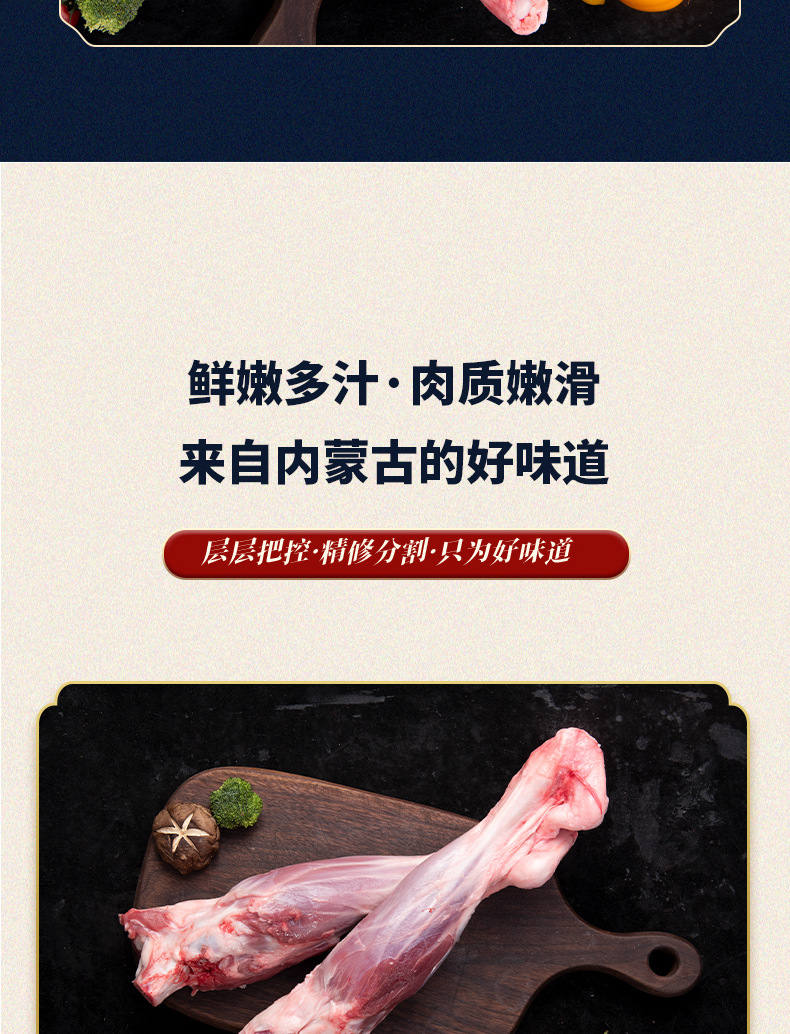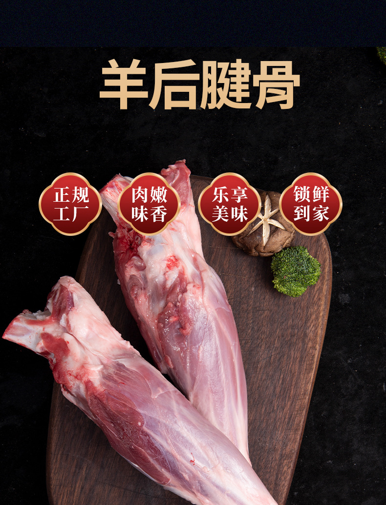 配料:原切羔羊后腱骨不添加原汁原味,羊后腱骨关节端锯平,柄部留白骨,每包内大头朝外交叉放置。羊后腱的腱肉肉质紧实,纹理清晰,肉中含筋。