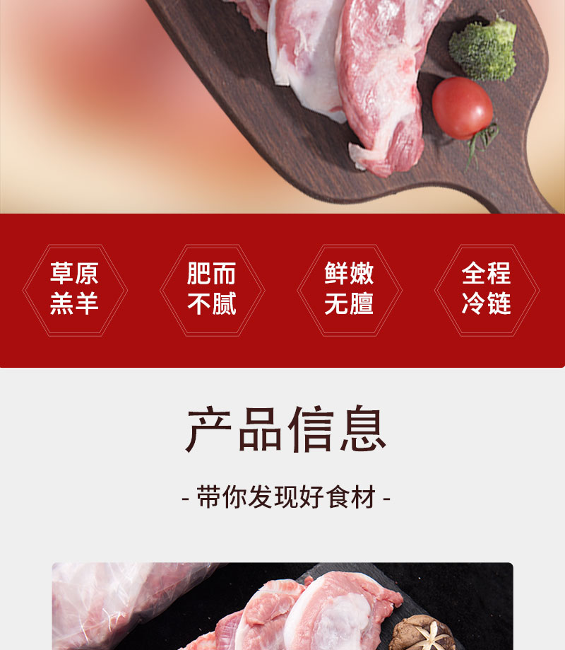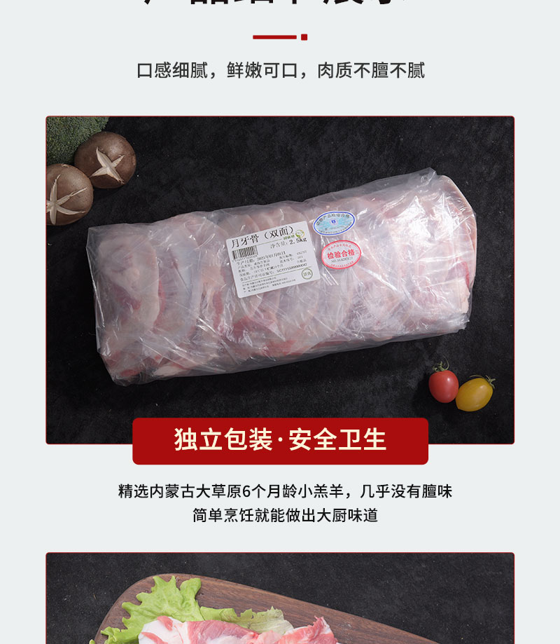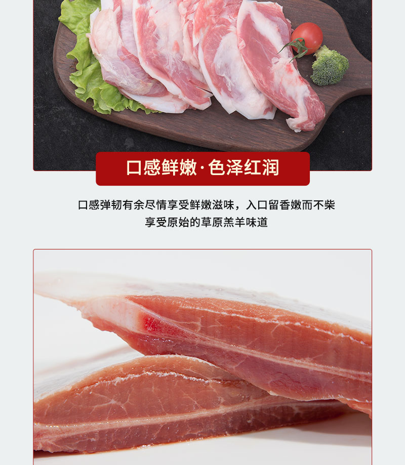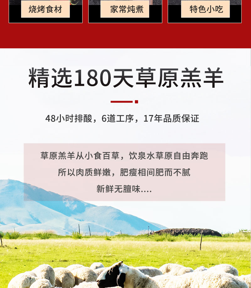 特点:优选广东大草原草饲羔羊,天然有机牧草丰富矿物质地下水孕育。散养羔羊自然生长六个月不育肥,羊肉嫩而不柴,鲜香不膻。