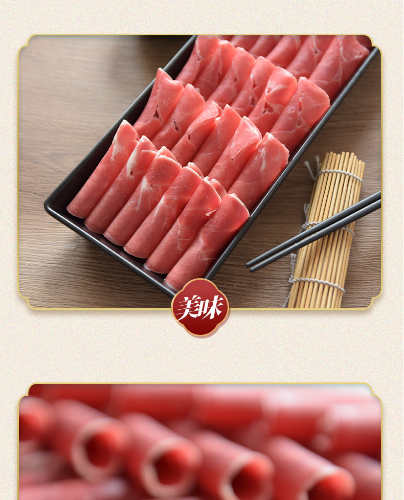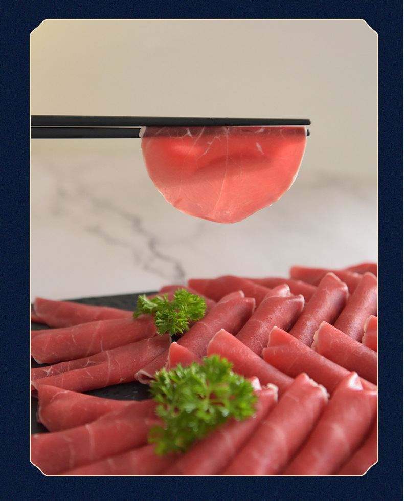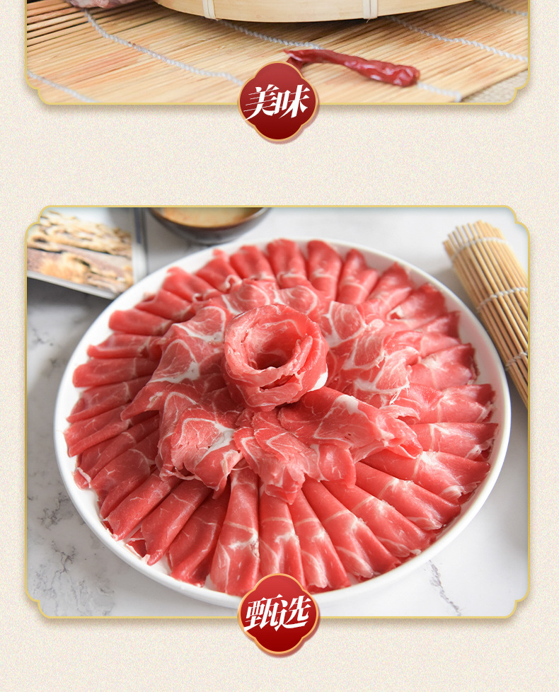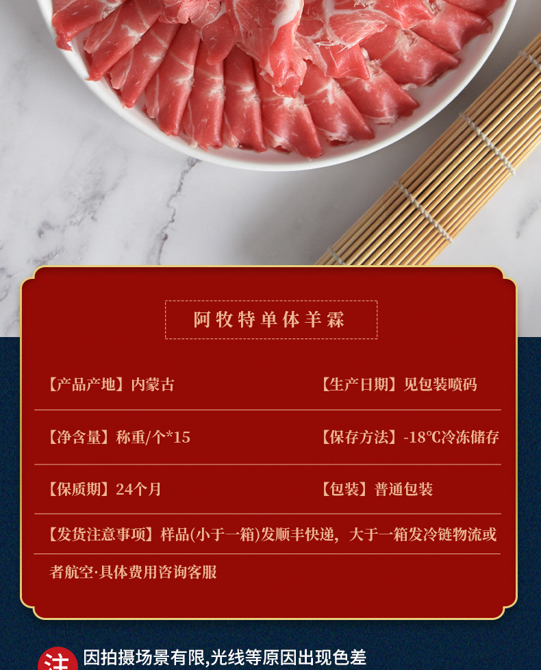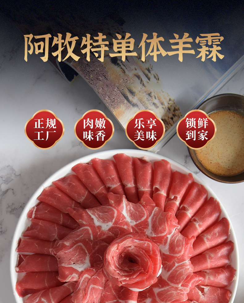 配料:羊霖部位肉,羊霖单个有保鲜膜包裹,独立单个包装。羊霖是羊后腿上的一块肉,在腿前端与与腰窝肉相近处,呈半球形,纤维紧密,肉外有三层夹筋,肉质鲜嫩不膻。