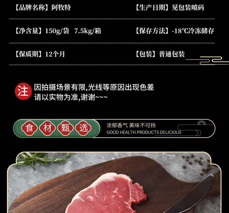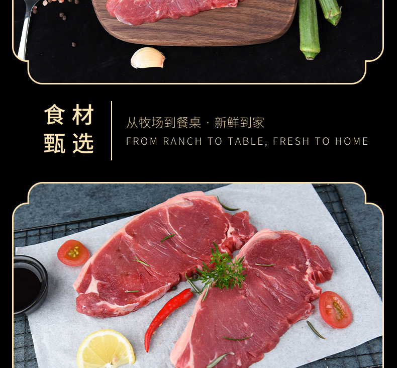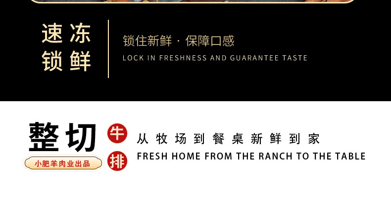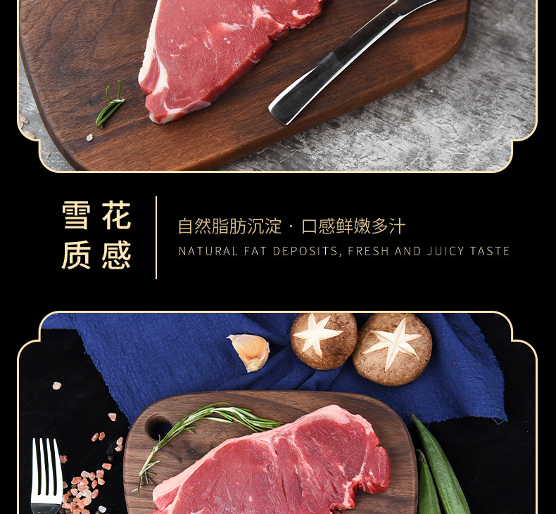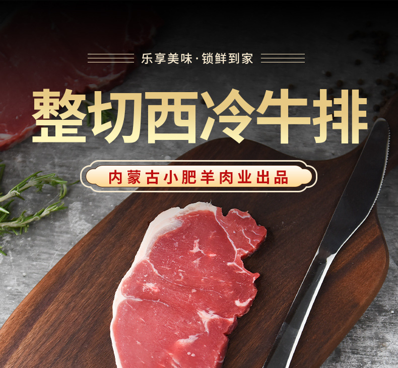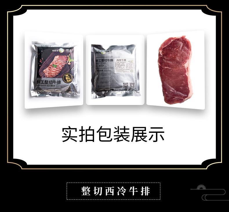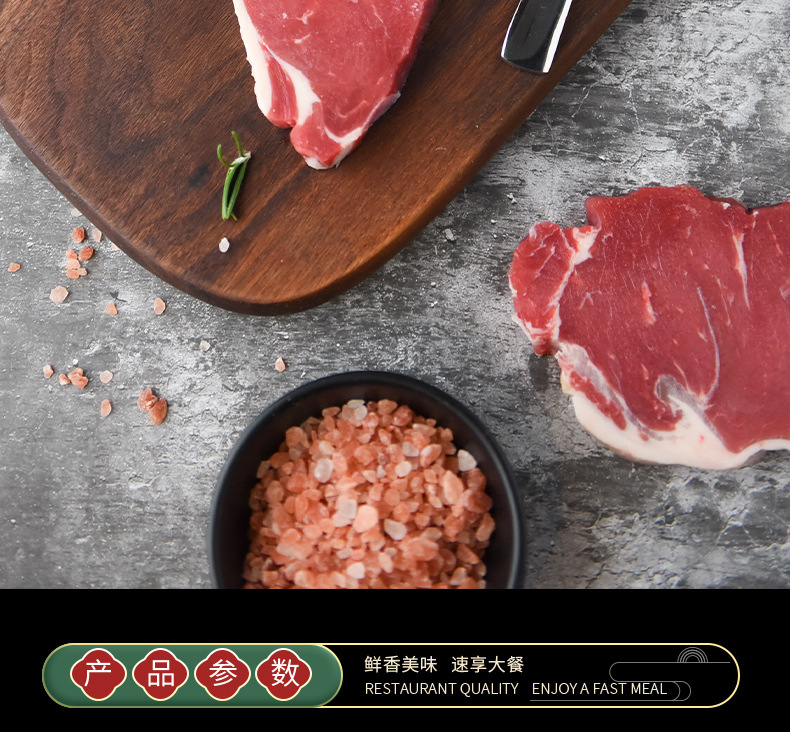 配料:西冷牛排,取自牛脊背一带的肉嫩牛肉,肉的边沿捎带一圈白色的肉筋,口感韧性强,纤维细嫩。澳洲谷饲西冷原肉厚切片,进行整块腌制速冻包装。