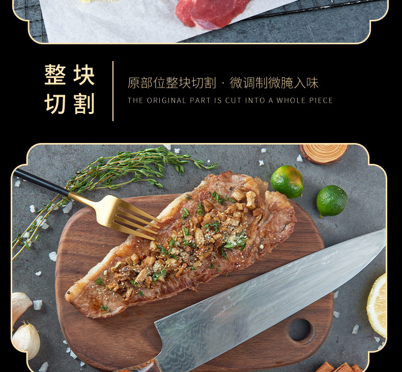 特点:牛部位整肉切割,不规则纹理清晰,微腌入味。牛排整切不拼接,手工打造,牛排纹理清晰,肉质鲜嫩,5-7分熟口感香甜多汁。
