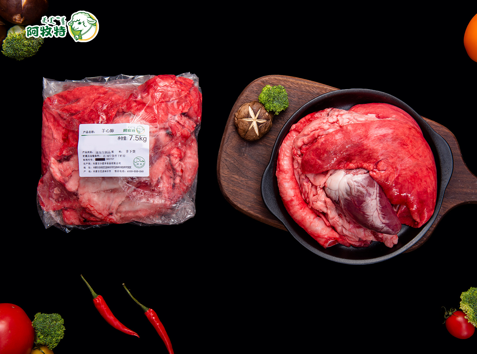 配料:羊心肺连体,修选去除天蓬肉,直接装箱。羊心肺色泽鲜艳,纹理清晰,富含蛋白质、维生素等,营养丰富。