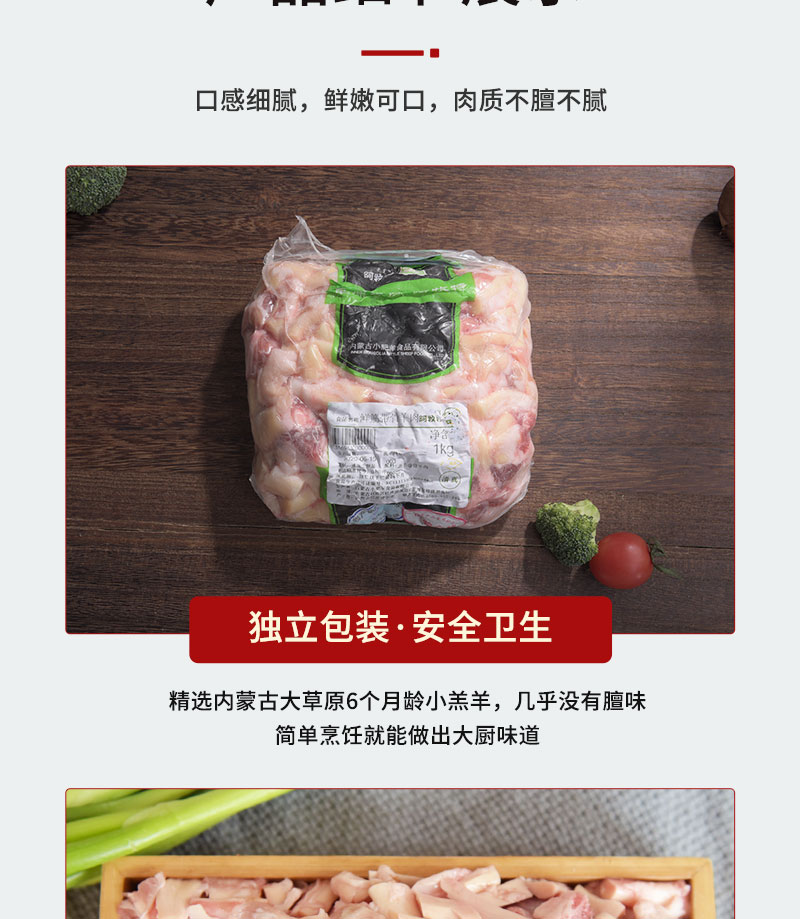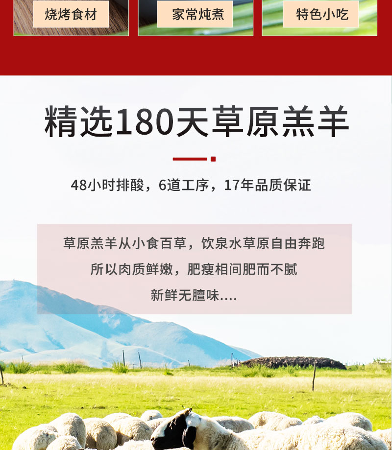 特点:优选广东大草原草饲羔羊,天然有机牧草丰富矿物质地下水孕育。散养羔羊自然生长六个月不育肥,羊肉嫩而不柴,鲜香不膻。