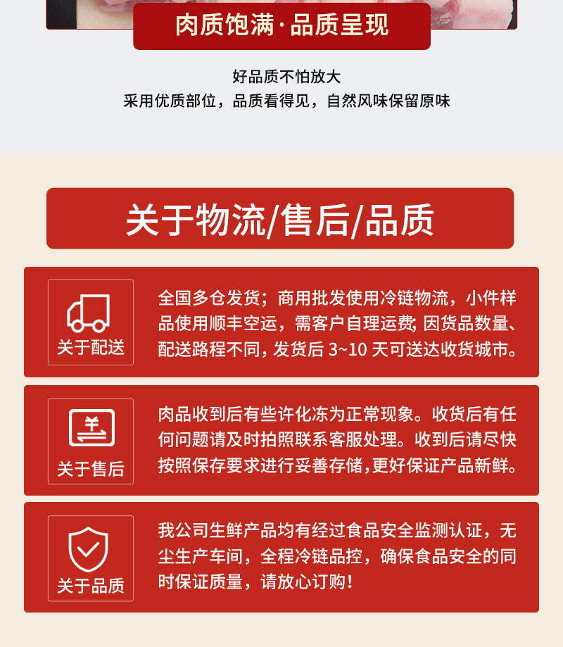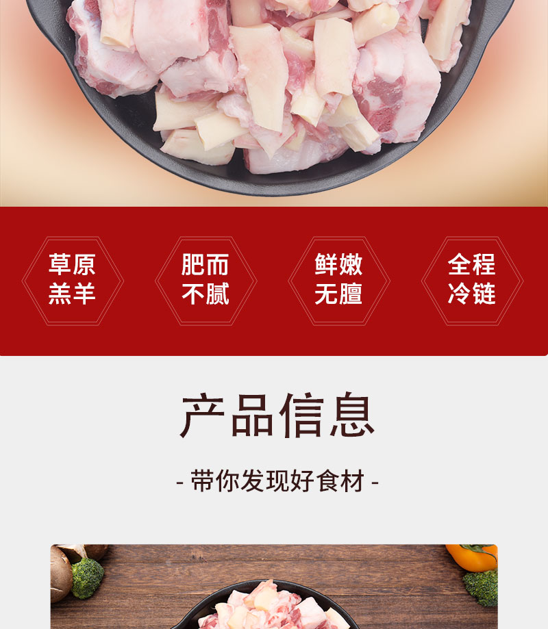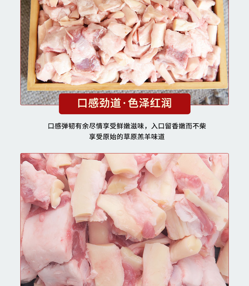 配料:胸叉骨切割成2.5cm的块与黄筋1:1密封包装。鲜筋带骨羊肉有肉,有骨,有筋,口感丰富,层次分明。