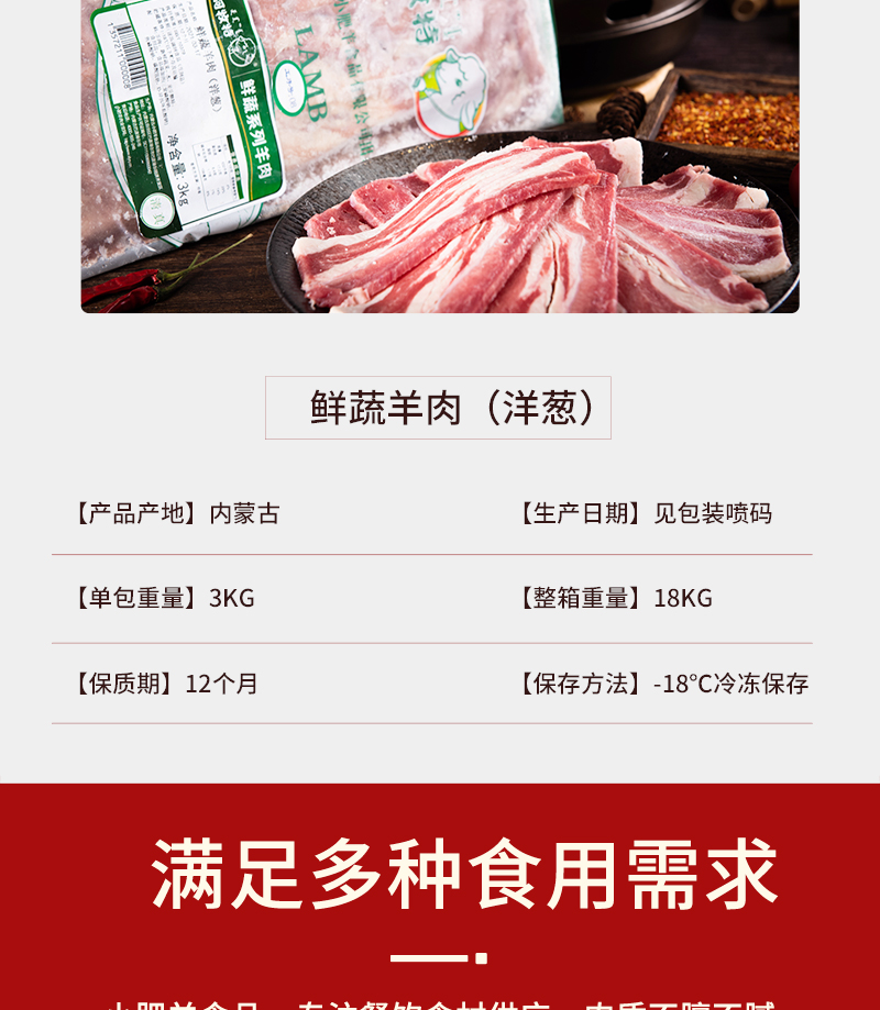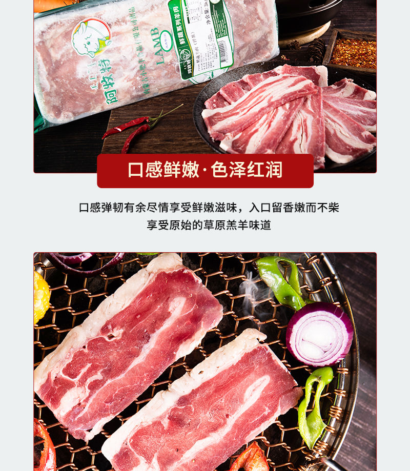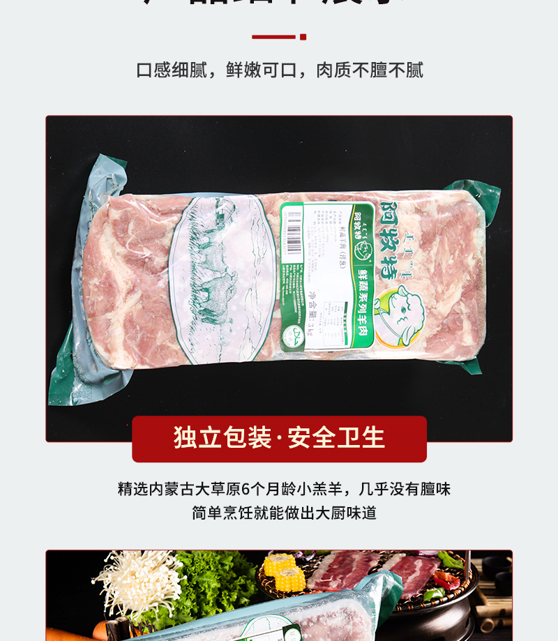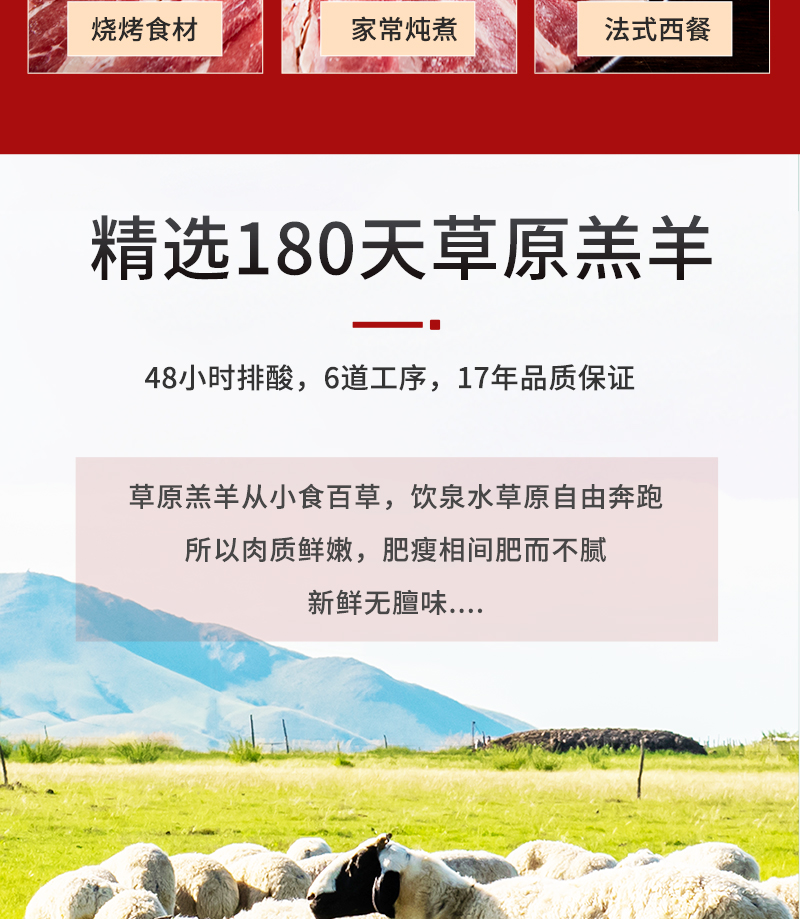 特点:优选广东大草原草饲羔羊,天然有机牧草丰富矿物质地下水孕育。散养羔羊自然生长六个月不育肥,羊肉嫩而不柴,鲜香不膻。