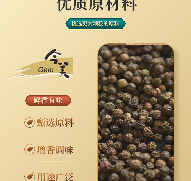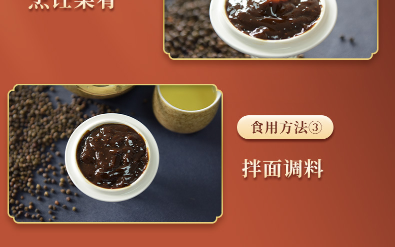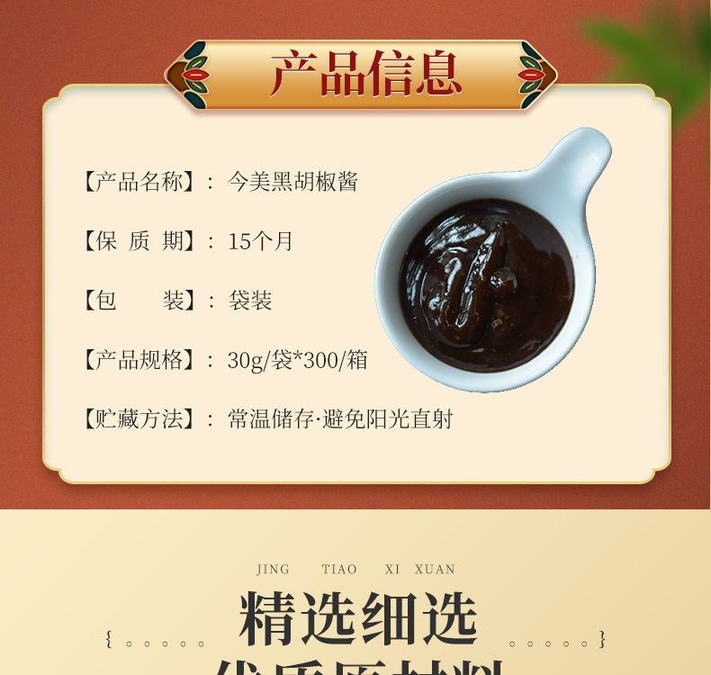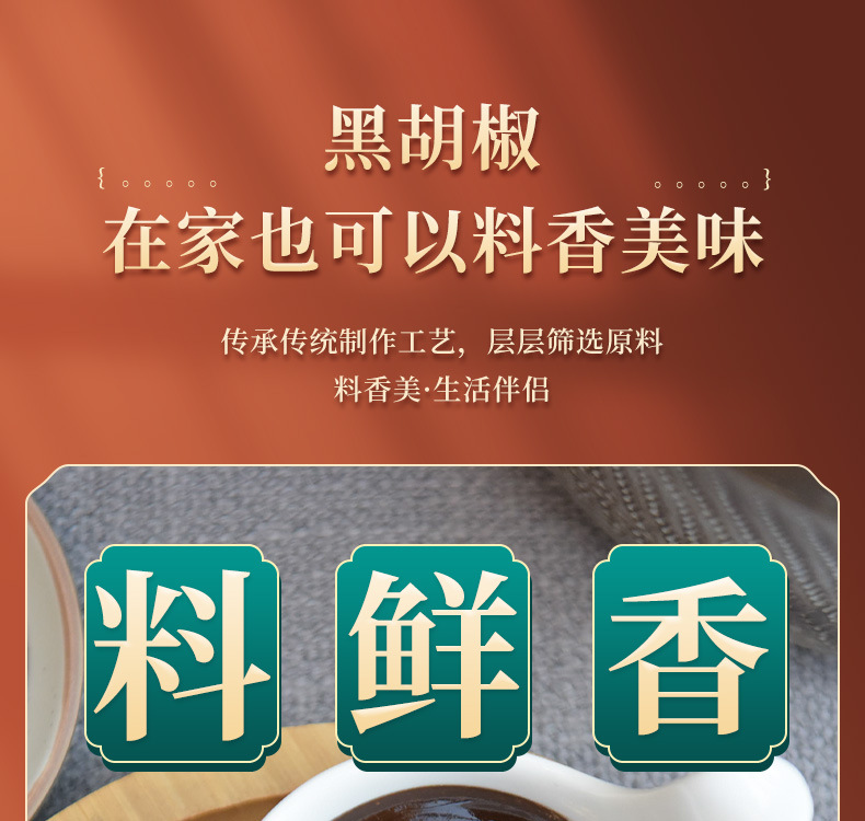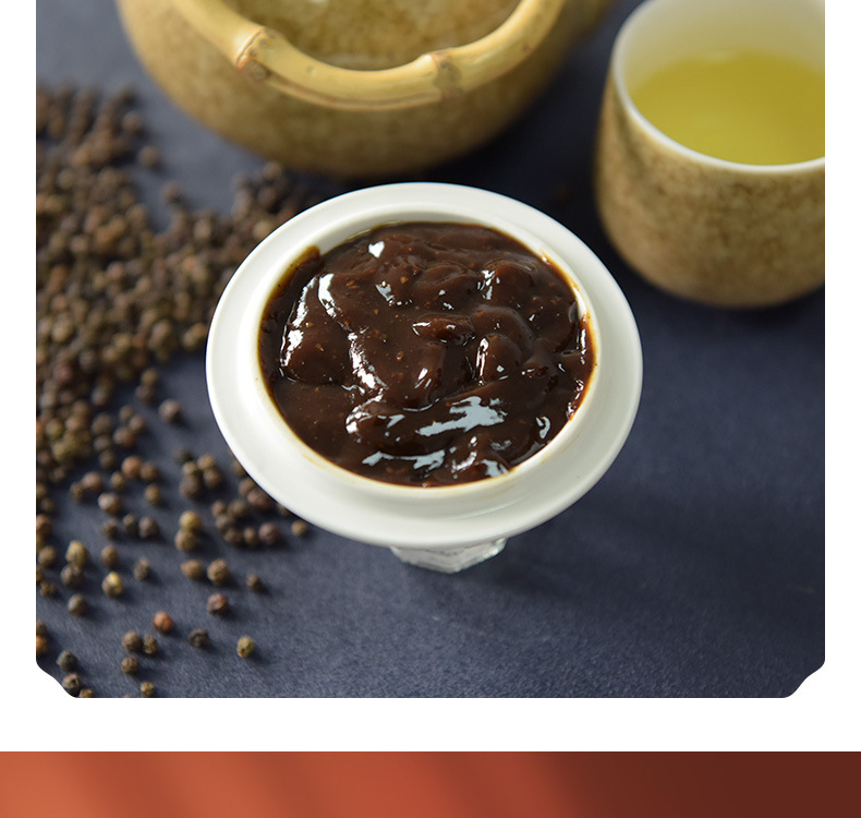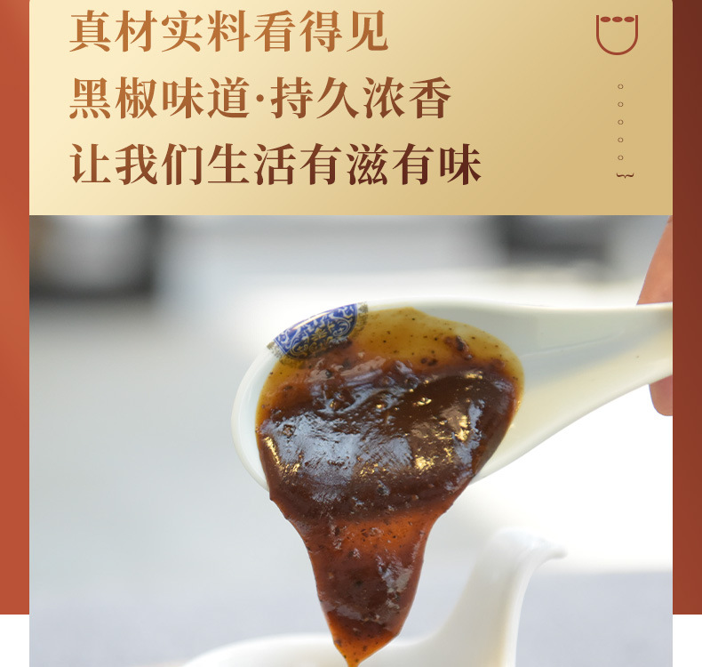 特点:丰满的黑胡椒果味辛辣,咸甜平衡,口味饱满。棕褐色酱体、色泽光亮,真材实料,肉眼可见黑胡椒颗粒。黑胡椒酱以天然酿造酱油为基础,通过熬煮孜然释放黑胡椒特有的辛辣美味,添加炒香的新鲜黄洋葱,使得甜、酸、香、辛均衡融合,酱香浓郁、自然醇厚,香儿不咸,口感丰富饱满
