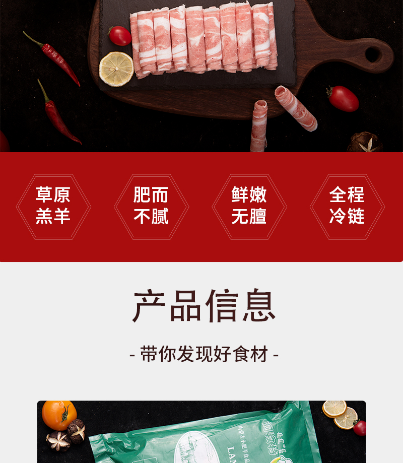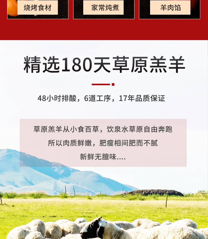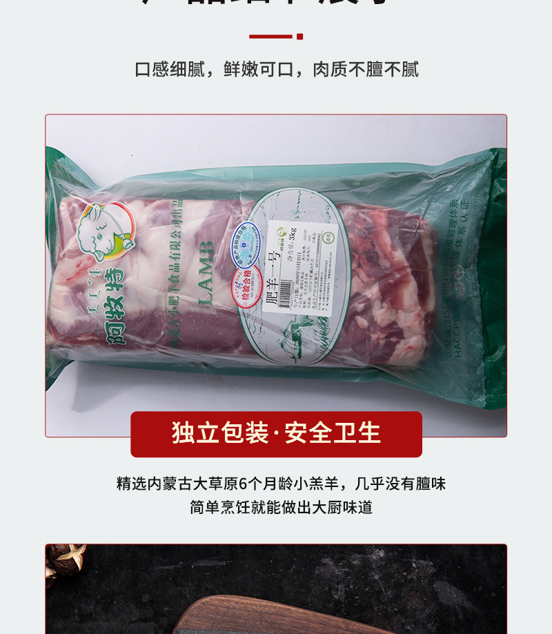 特点:优选广东大草原草饲羔羊,天然有机牧草丰富矿物质地下水孕育。散养羔羊自然生长六个月不育肥,羊肉嫩而不柴,鲜香不膻。