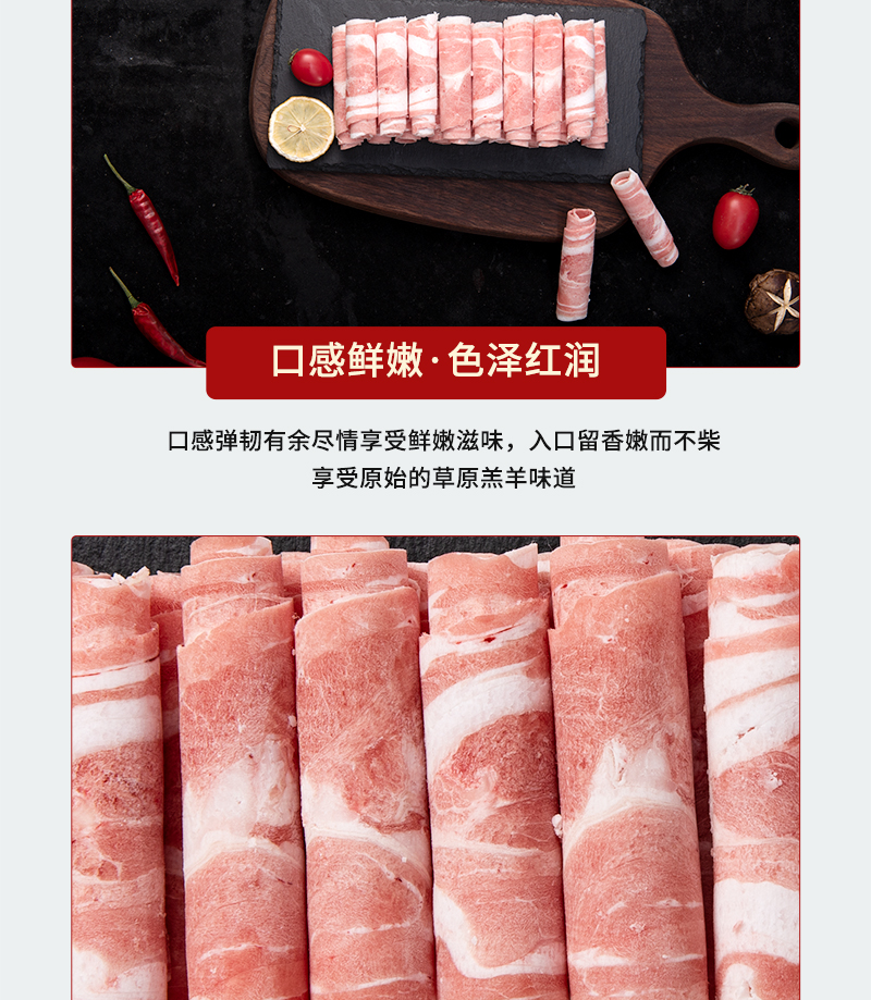配料:根据部位肉特性级脂肪分布情况,在固定模具里分层码放成长方形肉板。肥羊一号羊肉卷坯肉质细腻肥瘦均匀、保留醇香肉味,不腥不膻。口感多汁,味觉层次丰富。