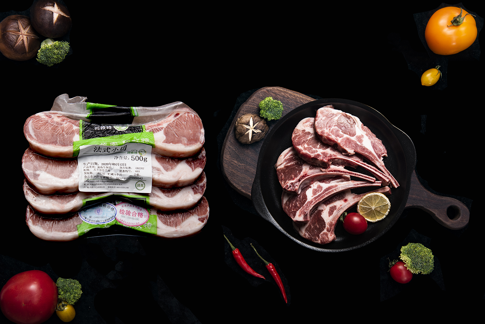 配料:整扇羊排先法式切割成十二肋的羊排,再用原切的十二肋法排直接切成1.6-1.8cm的厚片。战斧羊排的肉质软嫩,肥瘦均匀,汁水丰富。
