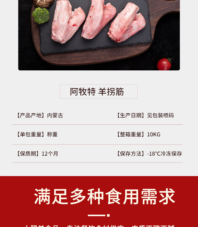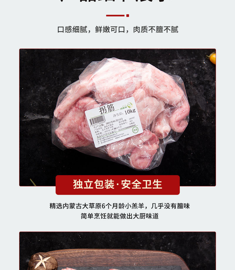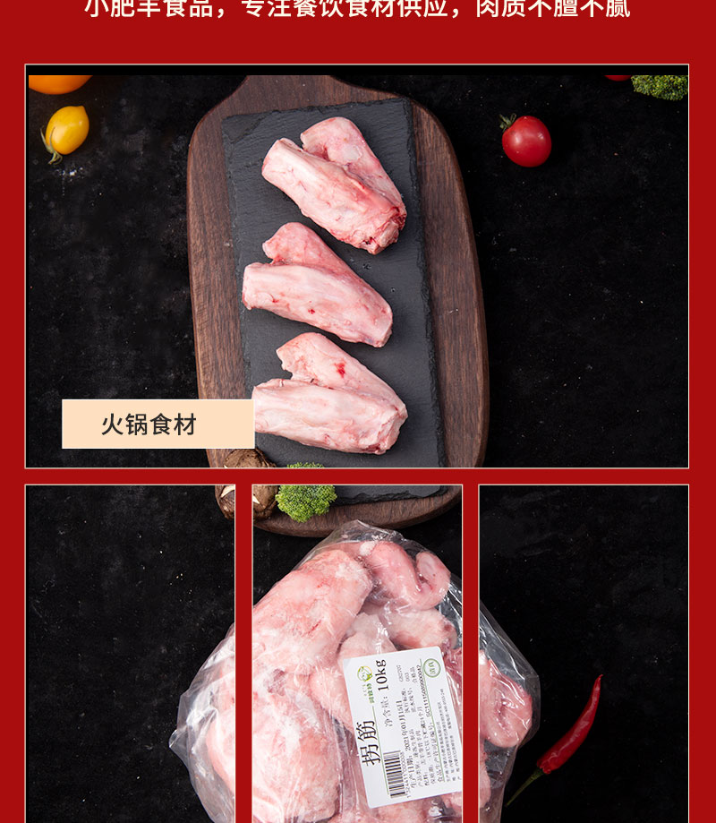 配料:整切羊腿部膝关节的筋,骨筋连接紧密,肥瘦均匀。拐筋胶原蛋白丰富,口感脆嫩,嚼劲十足。